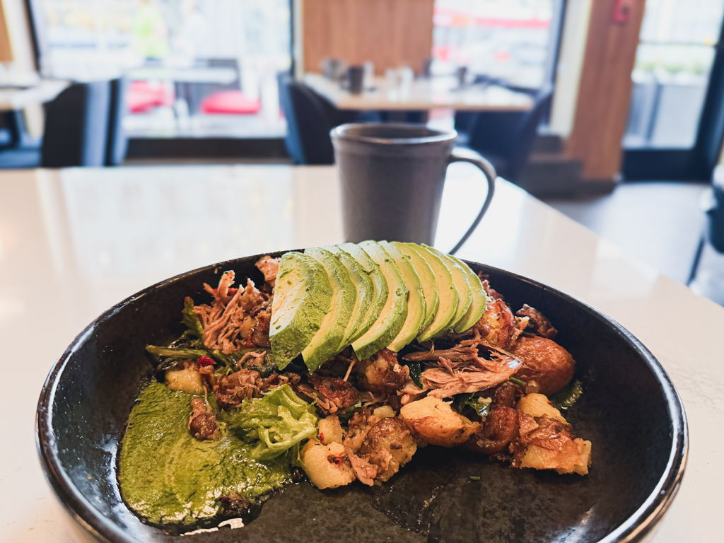 Along with my cup of morning sunrise, I enjoyed a plate of the DUCK HASH (confit duck leg, Calabrian chile, arugula, crispy potato, chimichurri, duck egg). I substituted the duck egg for avocado.