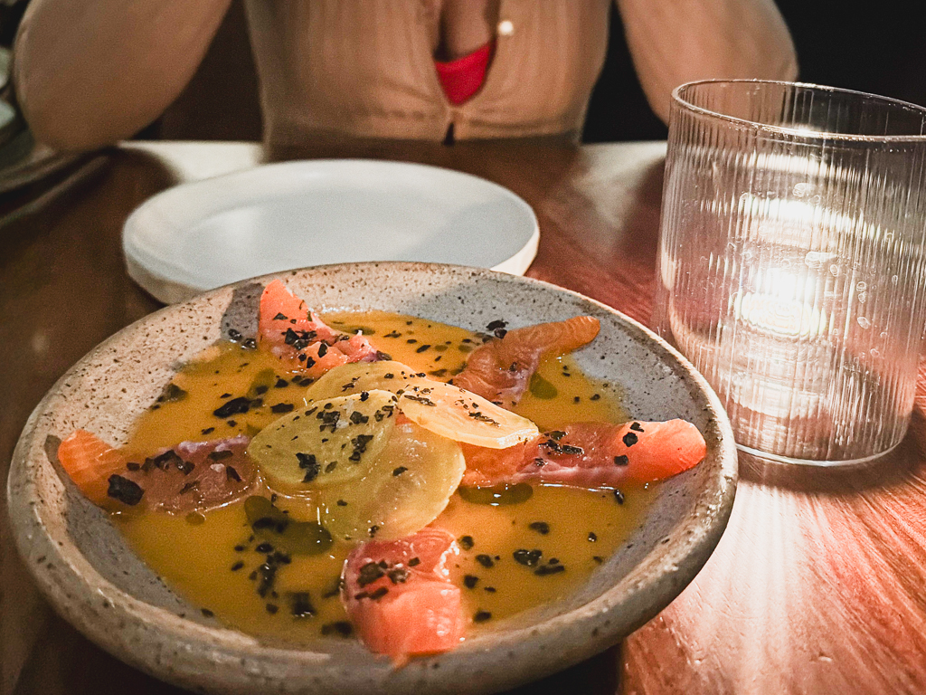 We began with the CRUDO CRIOLLO (Dry aged local Trout – Pickle – Salsa criolla – Roasted seaweed). Within moments of our first bites, we both relished the refined taste of lightly smoked trout.