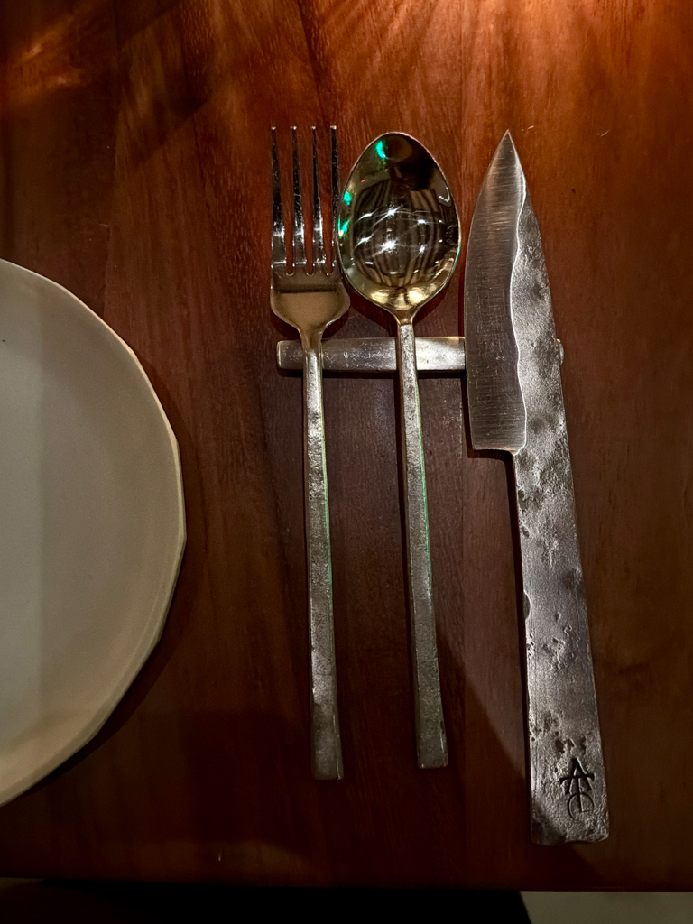 In preparation for our cornerstone course, we were brought out a new cutlery set – that was absolutely gorgeous. The knife looked like it was forged by hand and made with care. I loved the weight of it – as it balanced effortlessly in my hand. The feeling of looking forward to slicing what was to come with such focused intention felt – primal.