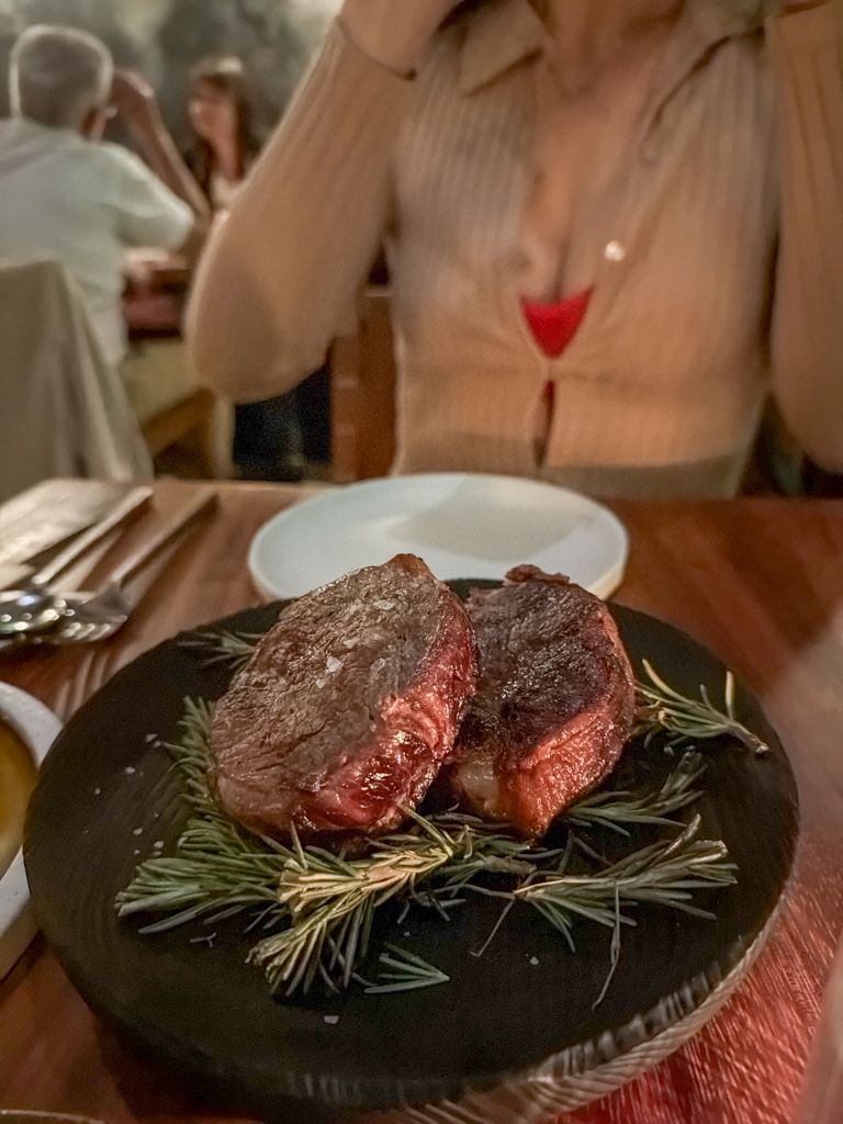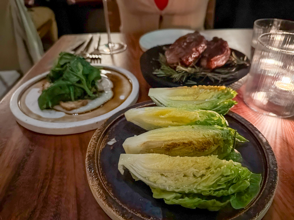 When our main dishes of the CORDERO PATAGÓNICO (12oz Lamb Saddle – Aged in beeswax for 14 days – Grilled over rosemary leaves), the LETTUCE (Half gem roasted & half gem fresh – Lemon vinaigrette) and the LIONS MANE (Roasted mushroom in the charcoal oven – Grilled spinach – Cauliflower puree Demiglace) arrived – we were ready with our knives in hand.