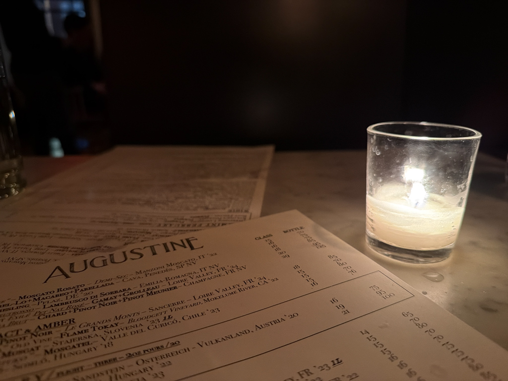 During the course of the day, I had an idea - why don’t we met at Augustine Wine Bar? Augustine Wine Bar is an incredible wine bar. It reminded me of my favorite wine bar, Bar Covell. I hadn’t been back in years. Namely, not since the space was rebuilt after the devastating fire. I then texted Kyle and awaited for a response. When Kyle texted back “sure”, I was excited to confirm.