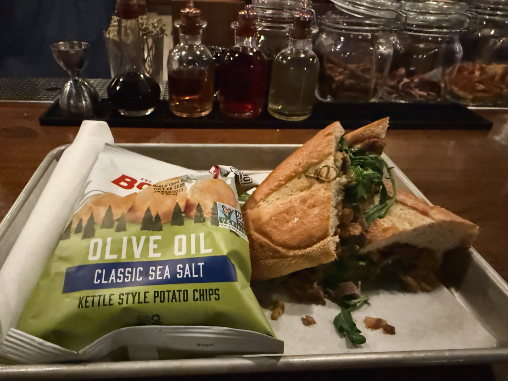 As one cannot survive at the bar with drinks along, I ordered THE STEAKHOUSE HOAGIE (Hoagie, Sirloin, Cheddar, Arugula, Garlic Aioli, Crispy Onion) with a side of CHIPS. It hit the spot perfectly.