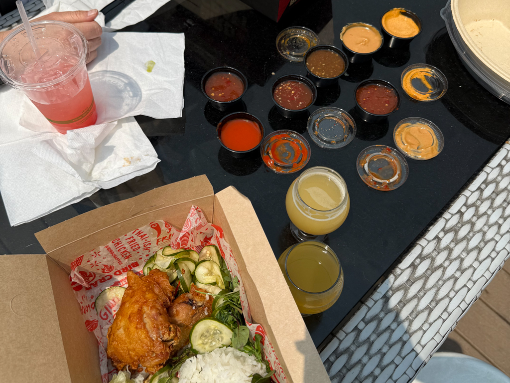 After some thought, I ordered the QUARTER BIRD (leg & thigh – jasmine rice, house pickles, fresh herbs) and for sauces, I chose them all: