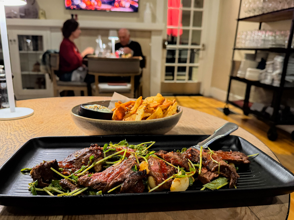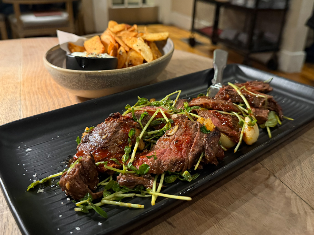 The WOOD GRILLED CERTIFIED ANGUS BEEF SKIRT STEAK (Trumpet Mushrooms, Confit Garlic, Korean Chili Butter) with my side of EVERYTHING SPICED FRIES (Fire Roasted Onion Dip) gave me the combined desire of protein and taste that I craved.