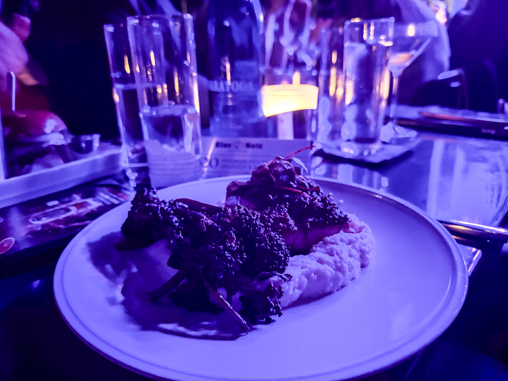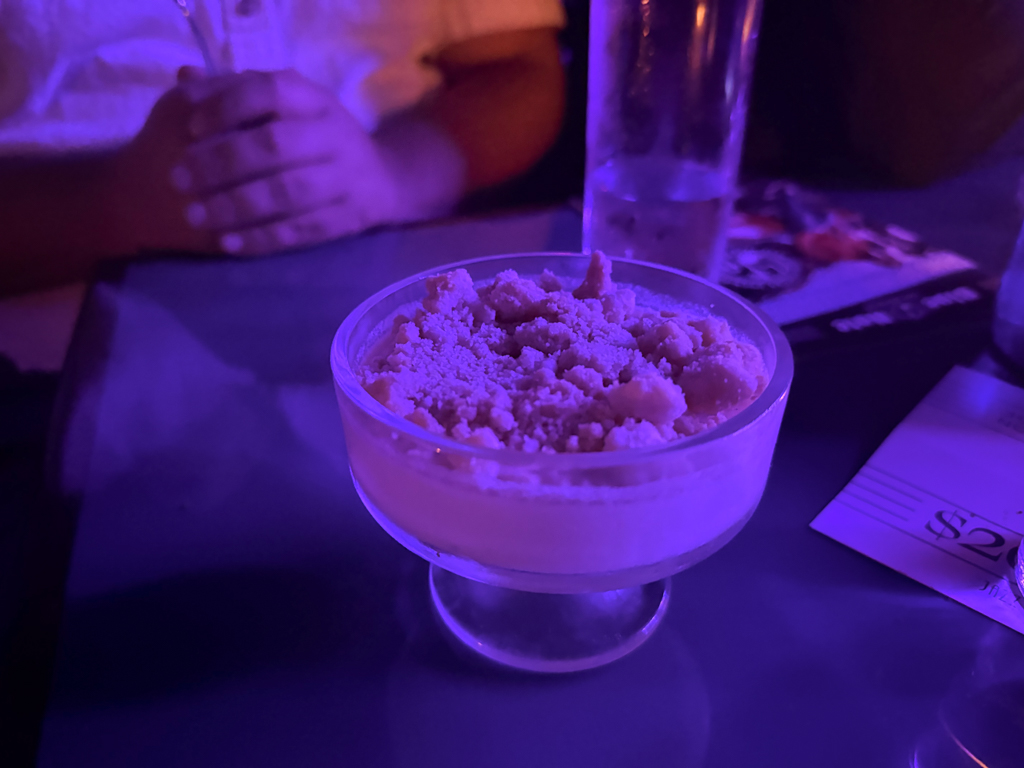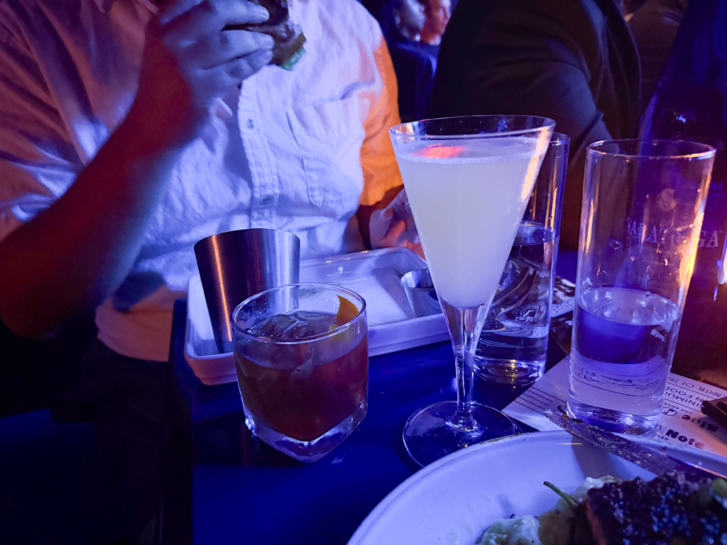 Wonderfully, my partner and I were seated in a beautiful seat in front of the stage. As our server arrived, I ordered a cocktail to start. The SMOKING ON THE BACK PORCH (Woodenville Bourbon, black tea-honey syrup, peach & Angostura Bitters, smoked) took so long to arrive, that I also received a complimentary PASSION OF THE 75 (Ketel One, passionfruit, lemon, topped with Prosecco).