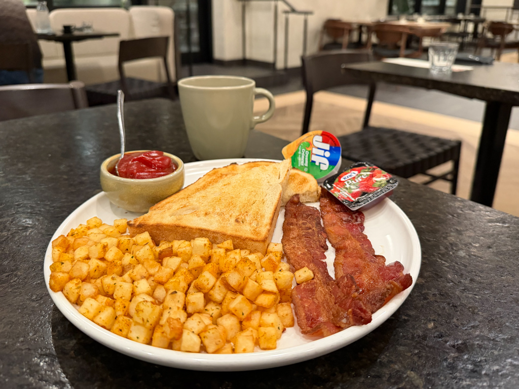 I built my own breakfast with the CONTINENTAL (choose 3 items from the add-on section, served with your choice of drip coffee, tea, or juice). I chose the Bacon, Hash browns and sourdough toast.