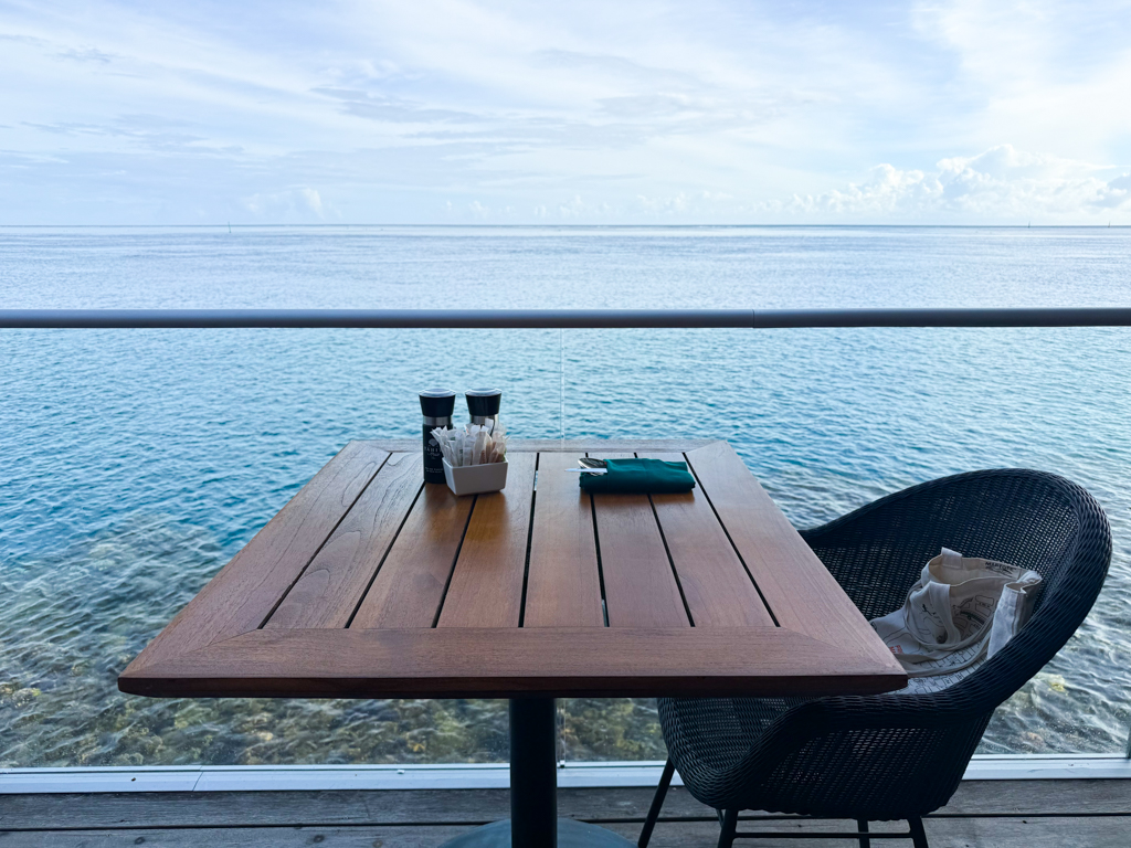 The view alone was worth waking up for: vibrant parrotfish and other fishes swam just below the surface, next to my table. I’d hoped to see them while snorkeling. But there they were, right in front of me.