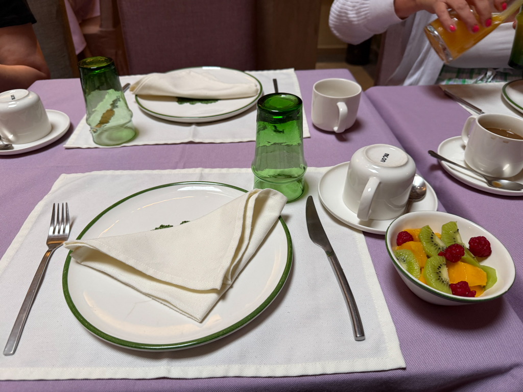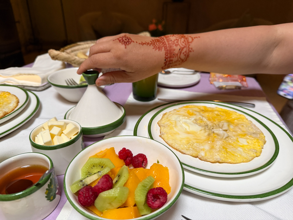 Breakfast during the second day was a rather quick affair, as I had to scarf food down in time for Walking the Streets of Marrakesh: the Medina, Dar El Basha, Madrasa Ben Youssef and more with Soufiane Adnane. So, I delighted in the Cornbread cake, Fruit Salad (Mango, kiwi, raspberry) as other people had Eggs.