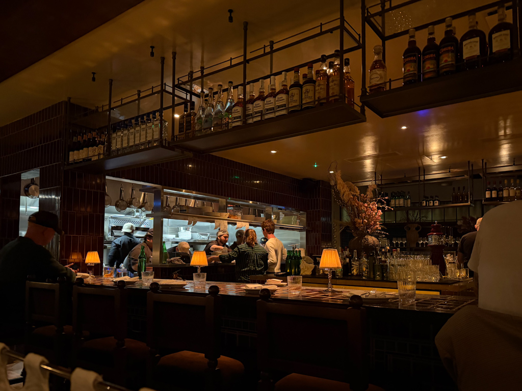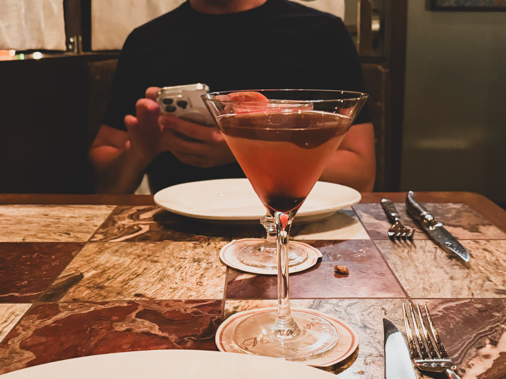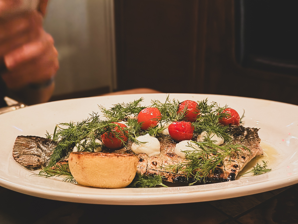 I sipped a beautifully crafted Manhattan Cocktail (whiskey, vermouth, bitters) as Jem and I devoured the WHOLE GRILLED BRANZINO (calabrian chili roasted tomatoes, toum, lemon). This was – chef’s kiss. From the pan sauce to the fish itself – it was such a revelation of flavor and presence.