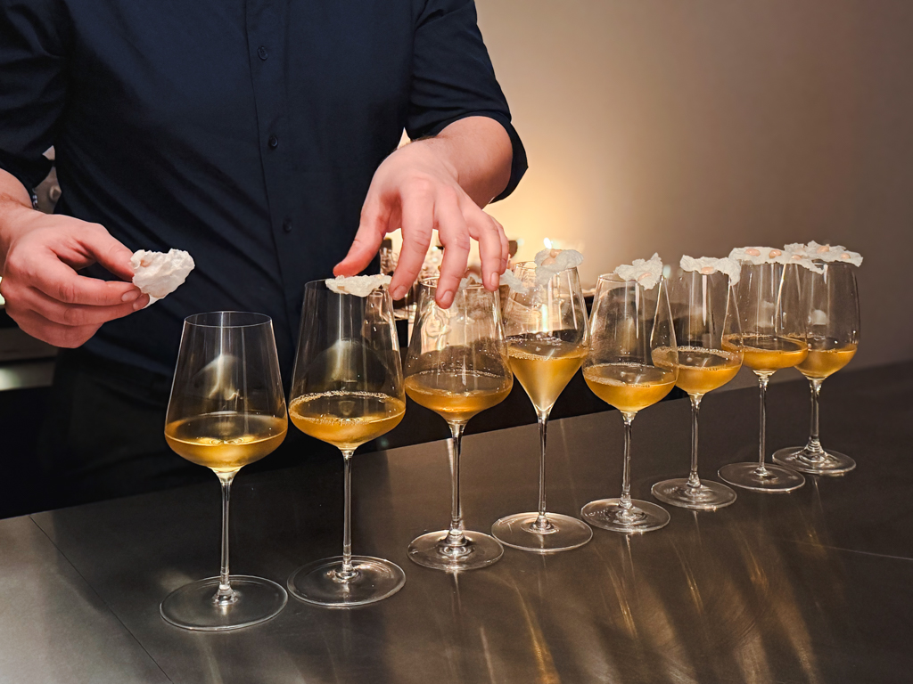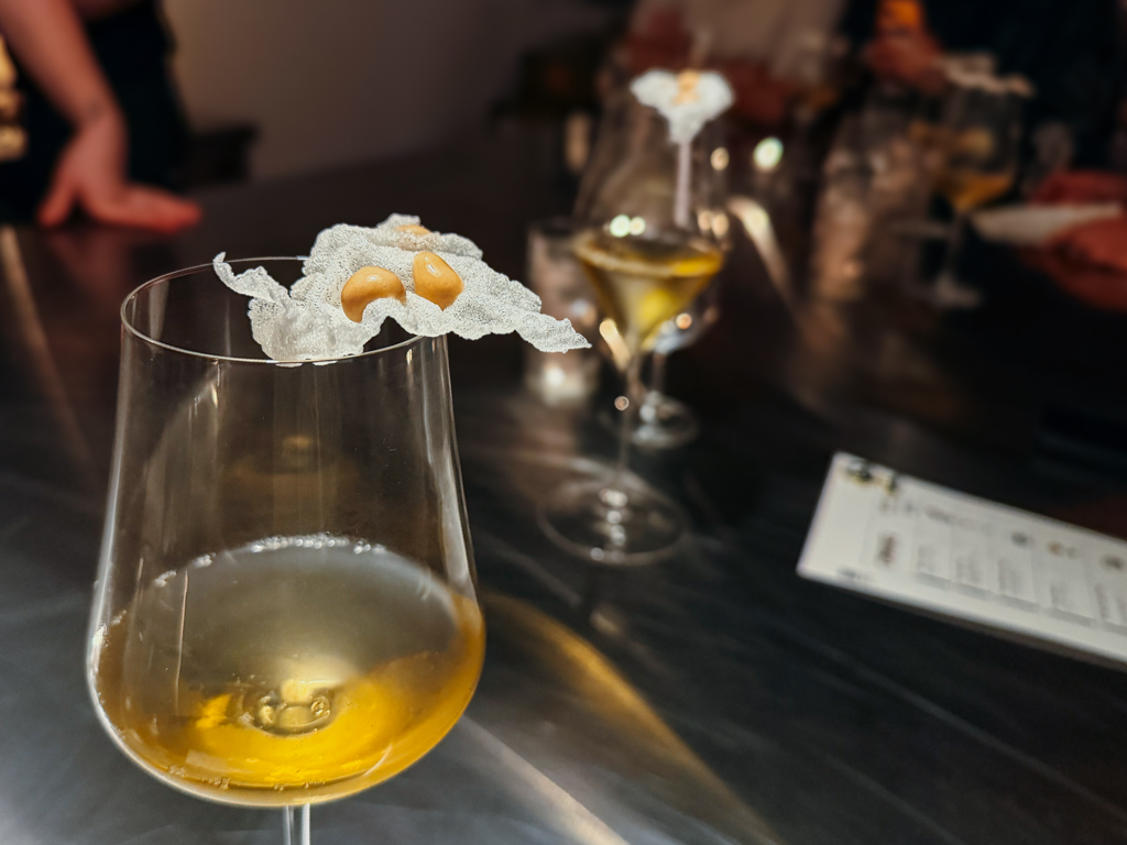 The tasting itself unfolded in stages, almost like a meal. The amuse bouche – FLORAL + TEA + BUBBLES – opened the evening with something light, floral, and refreshing. The “appetizer” –  BITTER + JUICY + TANG  – was smooth and delicious, with the clarified yogurt offering an oral revelation.
