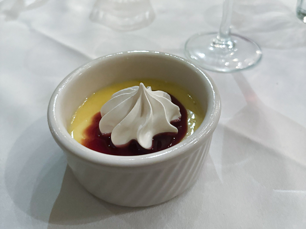 For dessert, I chose the Lemon Meringue (Pots of Cream, Raspberry Sauce), served in a small pot with a silky cream base and a drizzle of vibrant raspberry sauce.