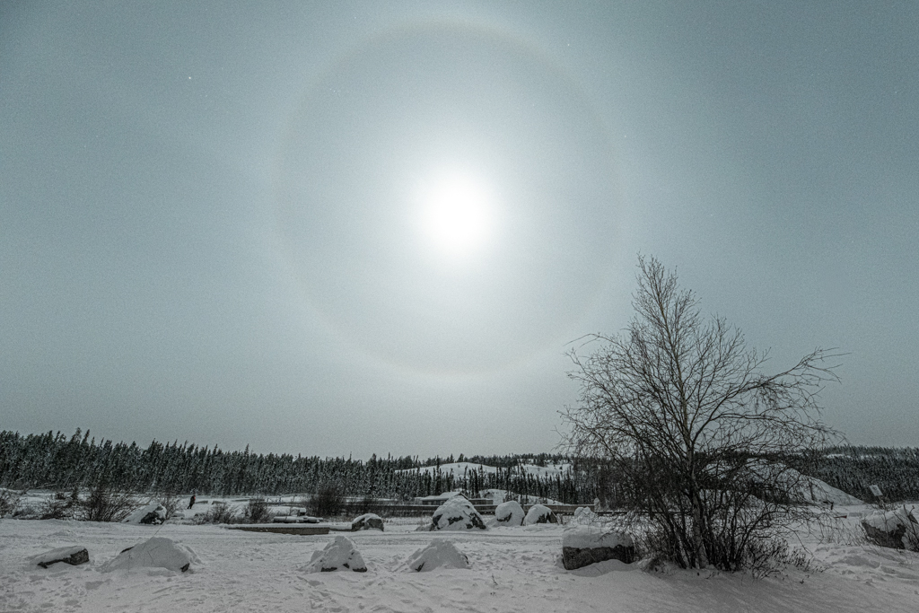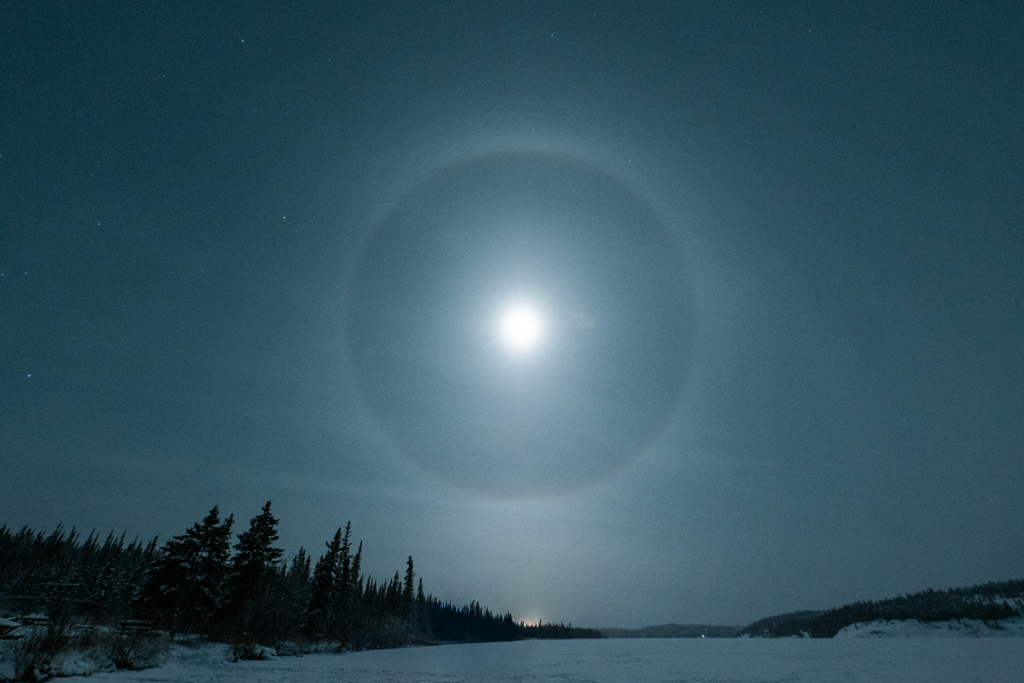 I took photos of the hazy ring around the moon and tried to take photos of the landscape as I stood on the frozen lake. When that got too much for my camera and my body, I shuffled back to the motor coach.