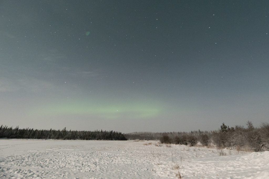 Getting back out, I focused my lens, shifted positions, and worked the scene. I captured a faint green glow that was invisible to the naked eye. The aurora revealed itself only through my camera, and I learned to negotiate with that fact while trying to get into the rhythm of moving and pressing my shutter to capture the scene.