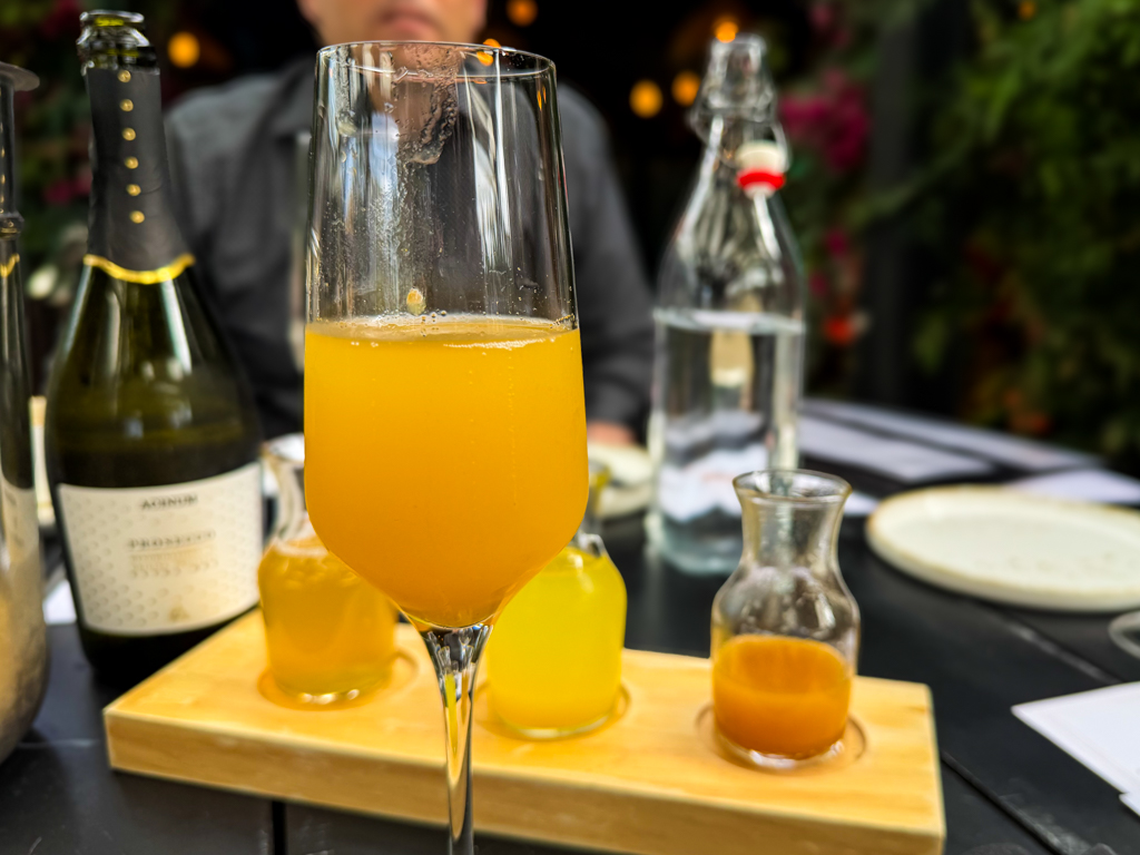 I enjoyed a few glasses from the Mimosa flight of sparkling wine and various juices, set on the table.