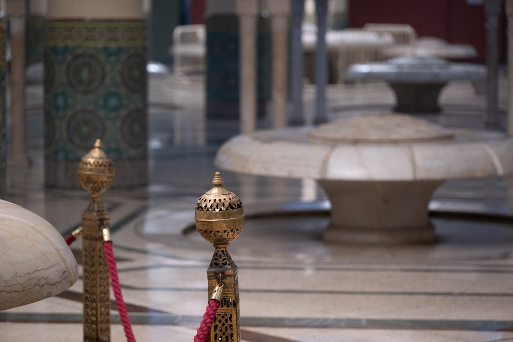 Descending into the Ablution Hall felt like entering another world. Supported by lotus-shaped marble fountains, this serene space is where worshippers perform cleansing rituals before prayer. Ashia described how the architecture mirrors spiritual intention – purity, renewal, and preparation.