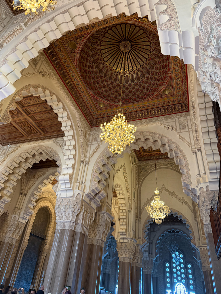 The mosque beautifully reflects Morocco’s natural resources and artisanal traditions. Ashia explained that the marble and granite used was sourced from the southern region of Morocco. The hand carved cedar wood was sourced from the Atlas Mountains. And the building’s massive titanium doors chosen for their resistance to rust – a necessity for a structure embraced by ocean air. Ashia also told us that the chandeliers held Murano glass in Venice, Italy.