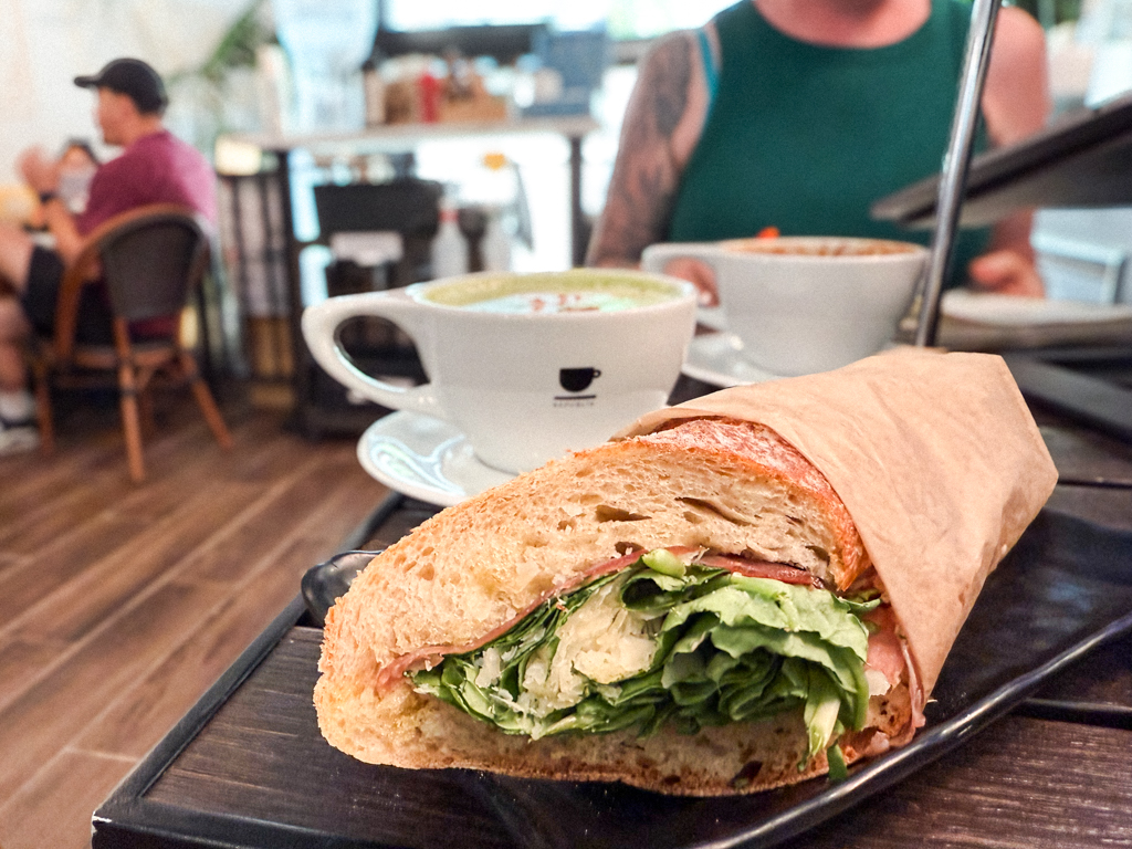 I ordered a ROSE MATCHA LATTE (Matcha, rose petal syrups, almond milk) and a Prosciutto sandwich (prosciutto, French brie, arugula, parmigiano, and extra virgin olive oil).