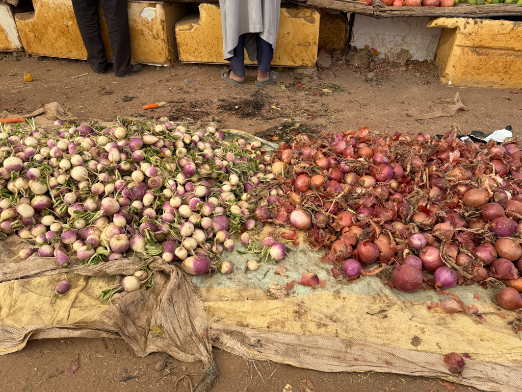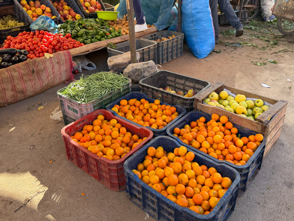 The outdoor market was lively and straightforward, with vendors selling produce, spices, leather goods, and everyday items.