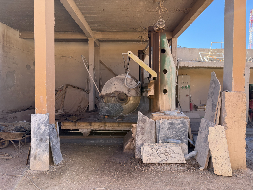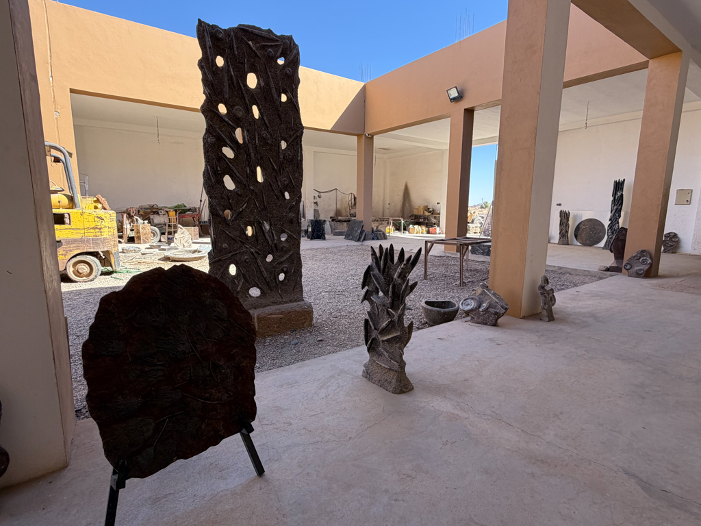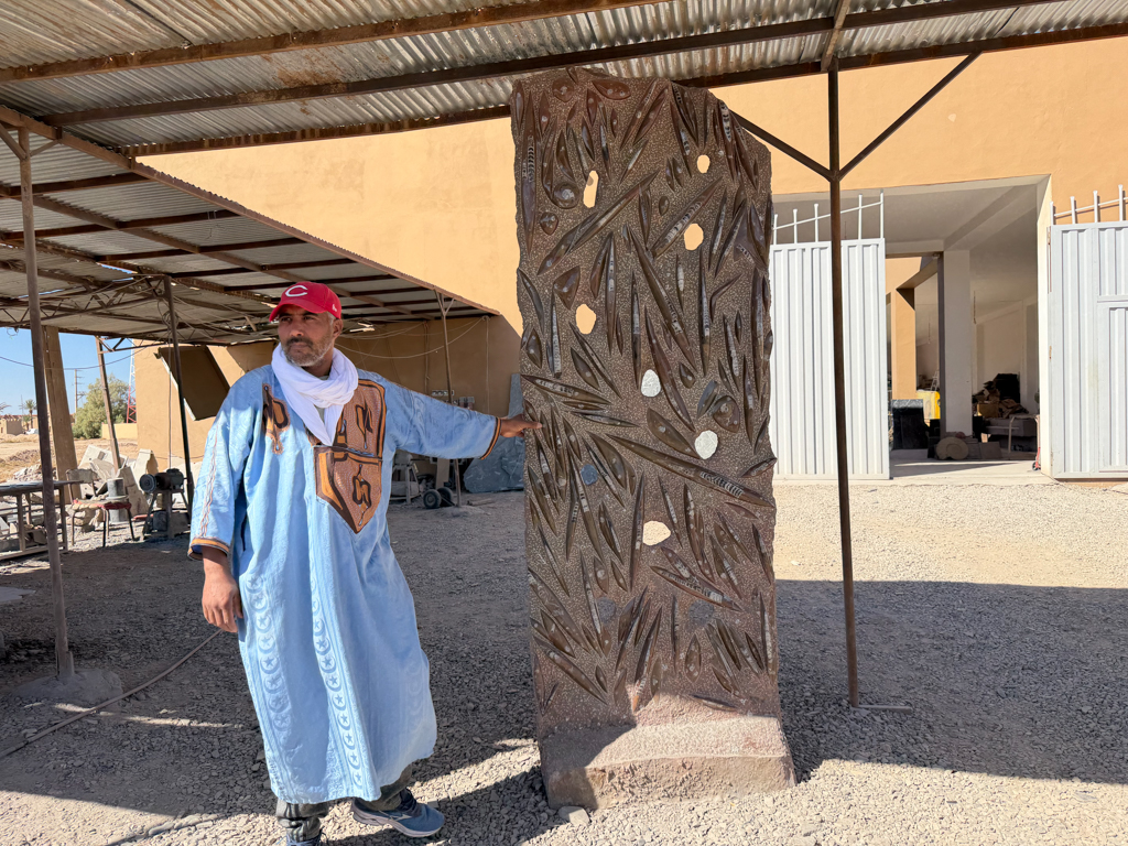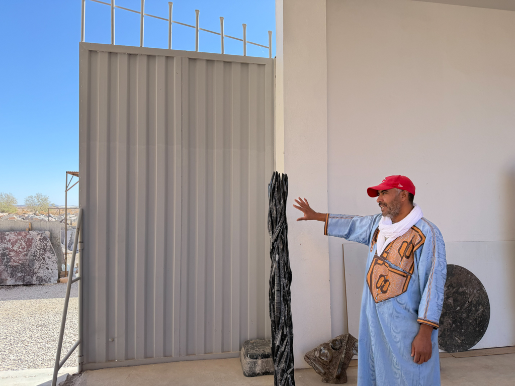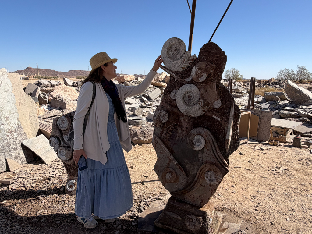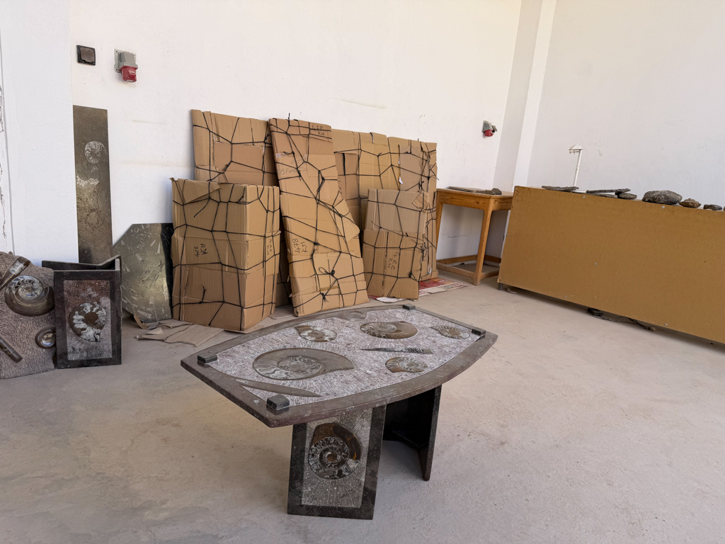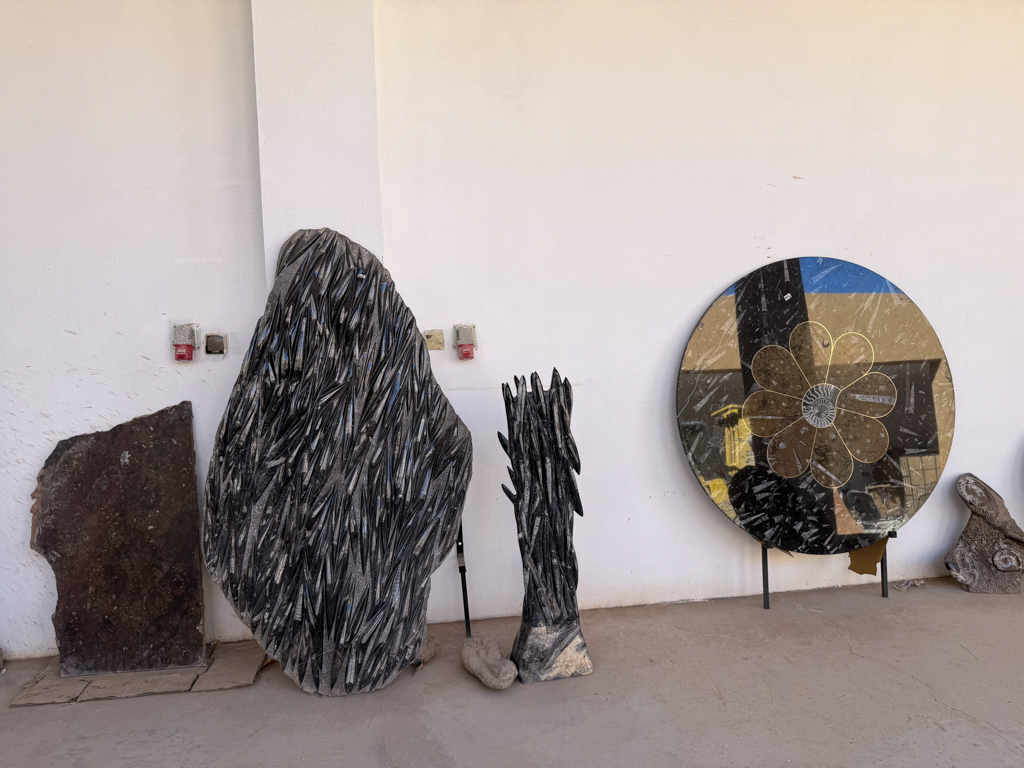These desert areas hold some of the country’s richest fossil deposits, and the kasbah showcases what has been uncovered. Inside the workshop, we watched skilled artisans use saws, grinders, and hand tools to carve fossils out of rough stone blocks, revealing ammonites, trilobites, and other prehistoric shapes hidden inside.