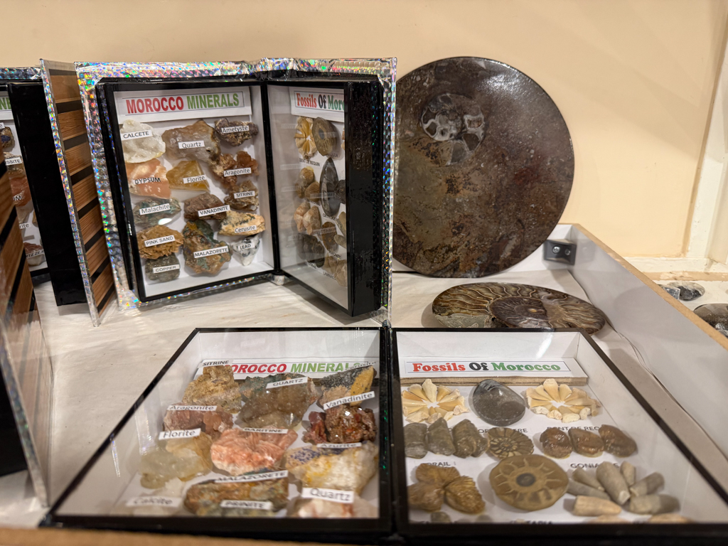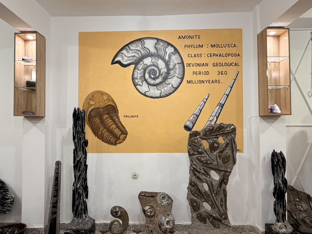 Maco Fossiles Kasbah offered a fascinating look into Morocco’s deep geological history, with many of its fossils sourced from the ancient seabeds and limestone layers around Erfoud and Rissani – regions that were underwater more than 300 million years ago.