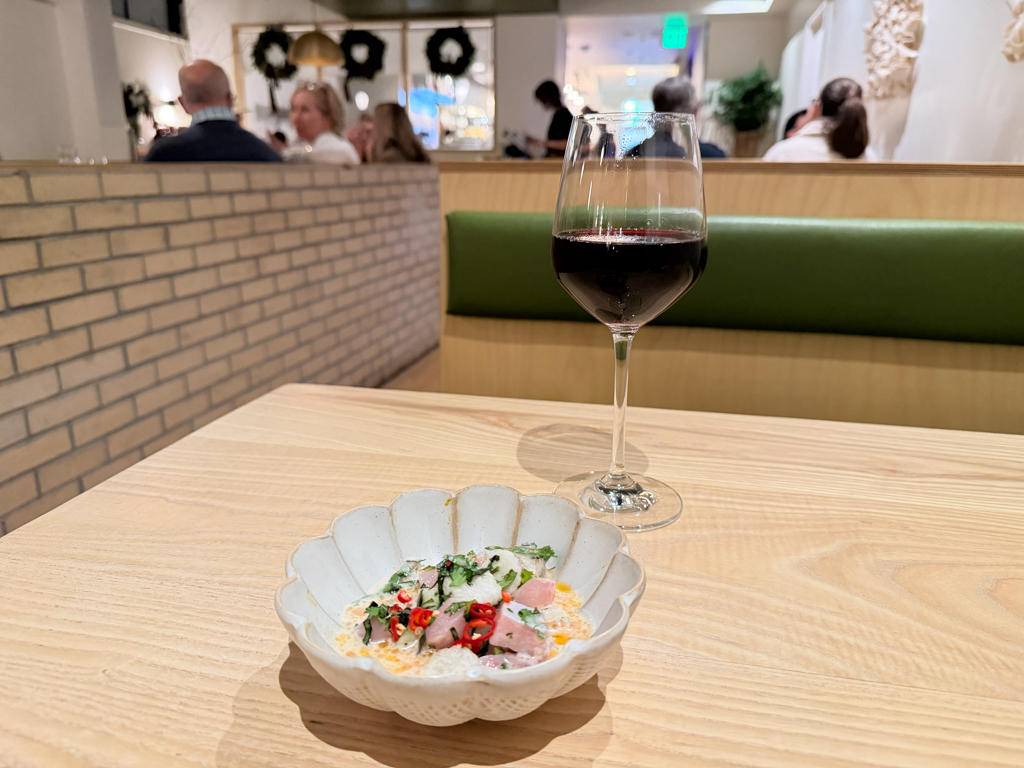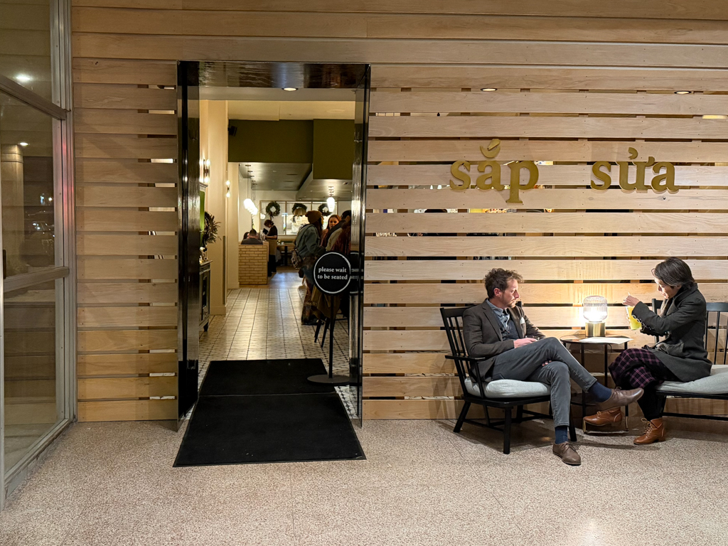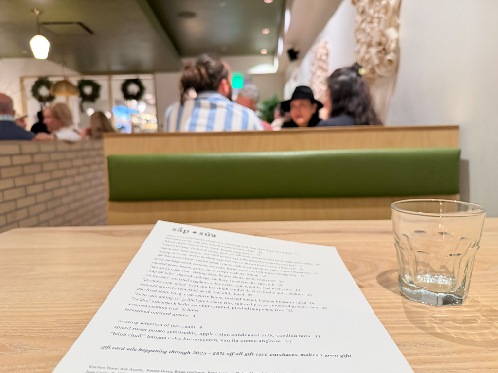 After a quick change in seating areas – I’d reserved the bar but now wanted a table – I was led to my dining space. As the host led me to my table, I loved stopping and noticing the book “Dac Biet: An Extra-Special Vietnamese Cookbook Book by Nini Nguyen and Sarah Zorn displayed on the hutch.