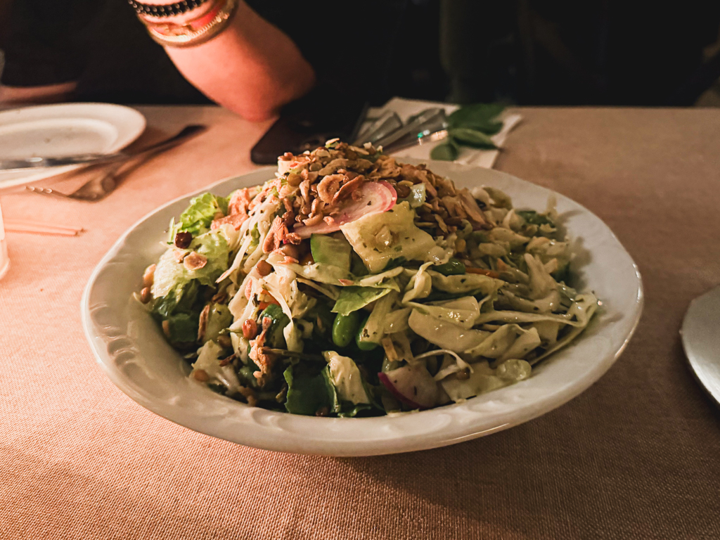 Fermented Tea Leaf Salad, cabbage and romaine, Persian cucumber, sungold tomato, snap pea, shaved radish, lemon and crispy lentils
