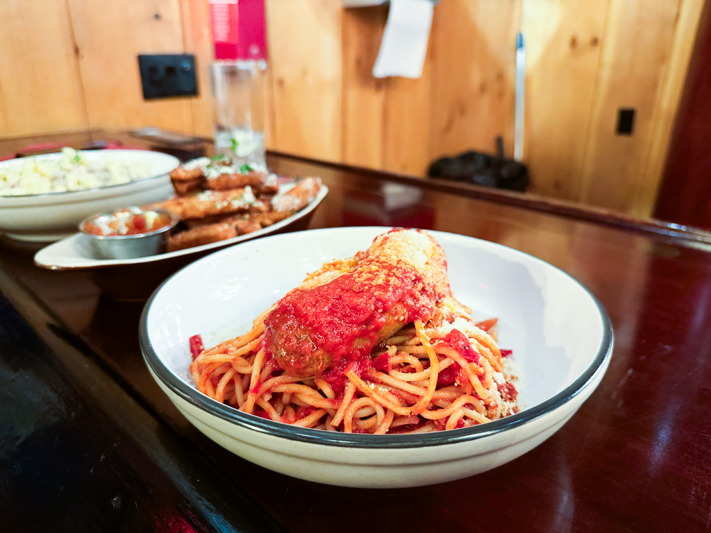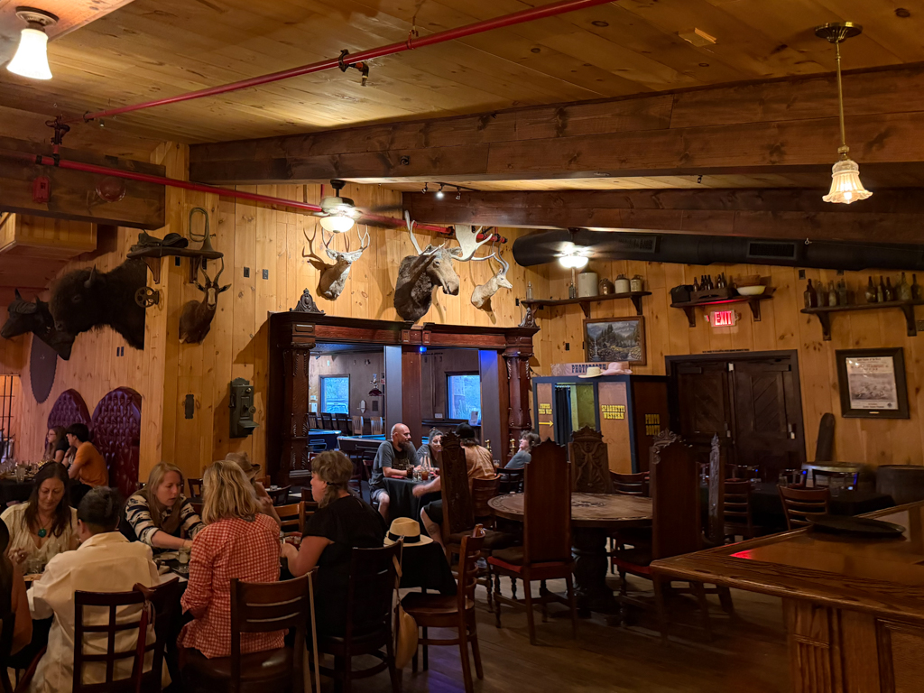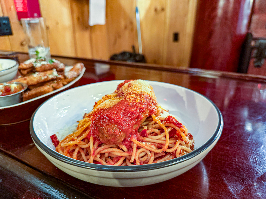 Walking in, we were both – confused. Spaghetti Western was an Italian spot housed in a western saloon styled interior. A large stage was center front of the restaurant – with two musicians playing jazz. Animal heads – from moose to bison – lined the upper walls.
