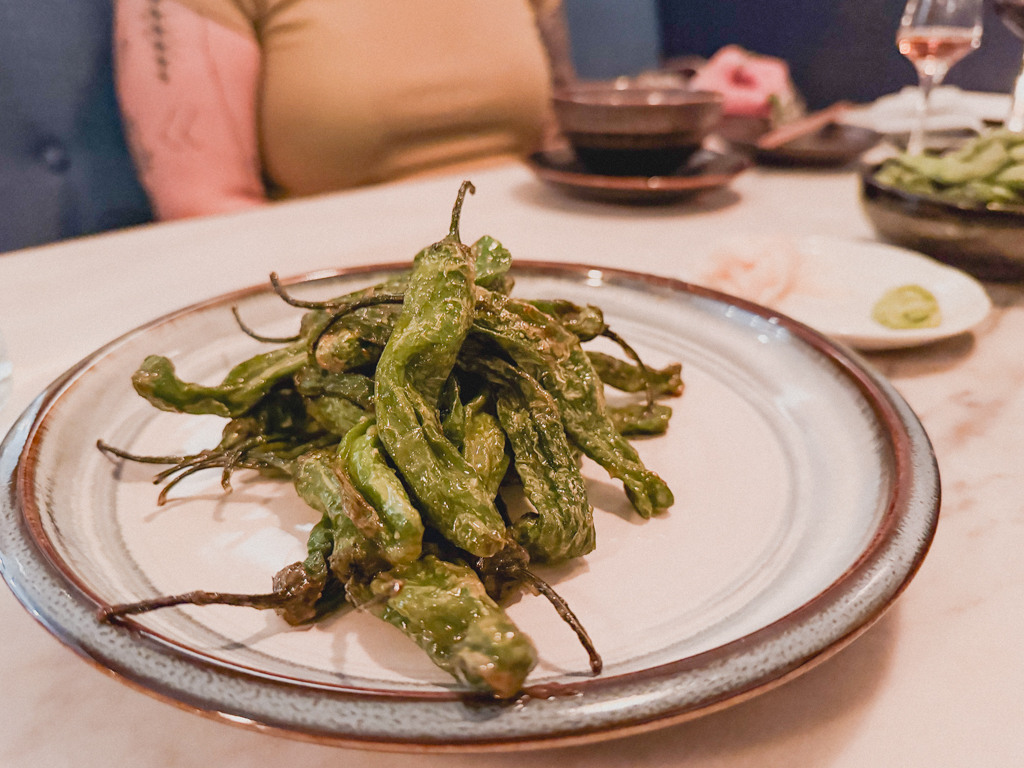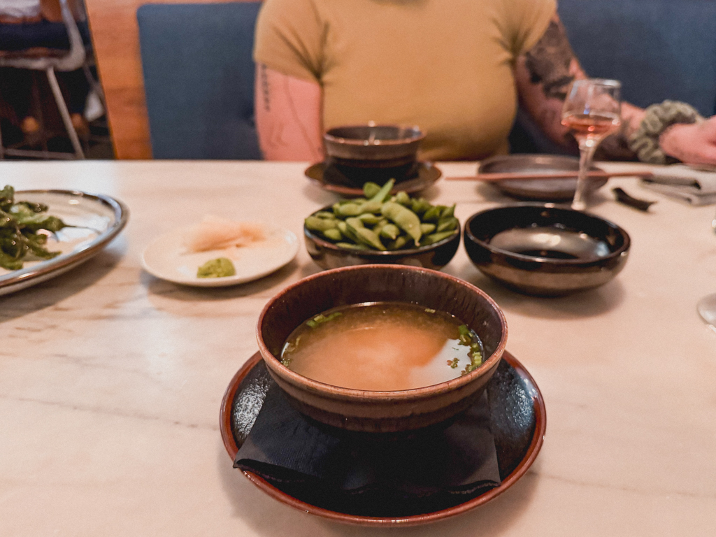 We began with the miso soup (green onion, tofu, dashi) and the Kuro Edamame (sea salt) along with a side of shishito peppers. This went perfectly with our welcome splashes of sparkling rose.