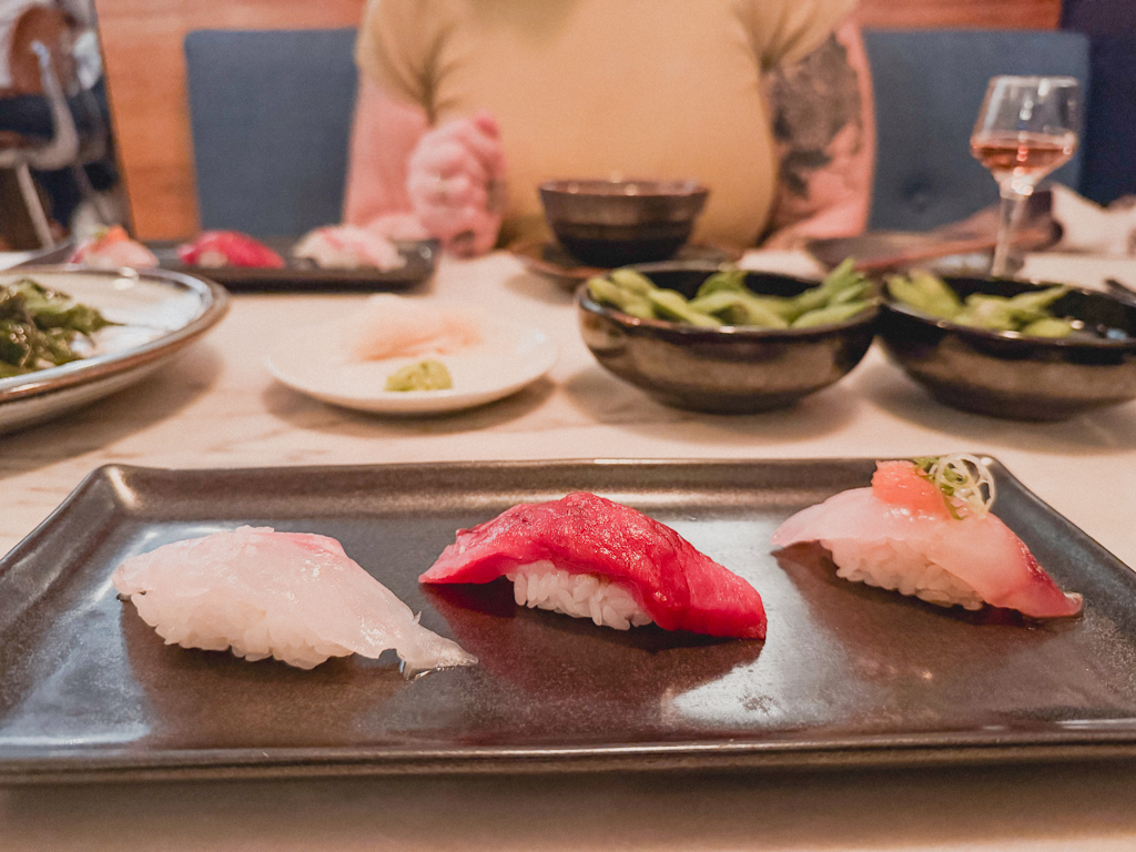 First 3 Sushi Selections: Madai (sea bream from Japan – with sea salt and yuzu); Akami (lean bluefin tuna from Spain with soy sauce); Itoyori (golden threadfin bream from Japan with grated daikon, chili, green onion and ponzu sauce).