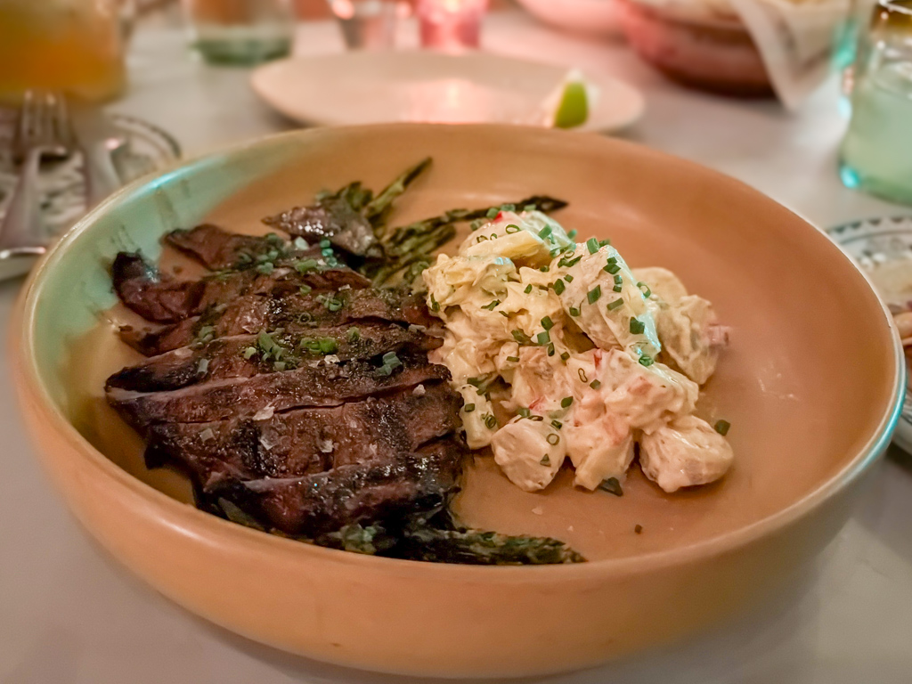 For our main dish, Tony and I split the SMOKY MEZCAL SKIRT STEAK (grilled asparagus, potato salad. chipotle-mezcal marinade).