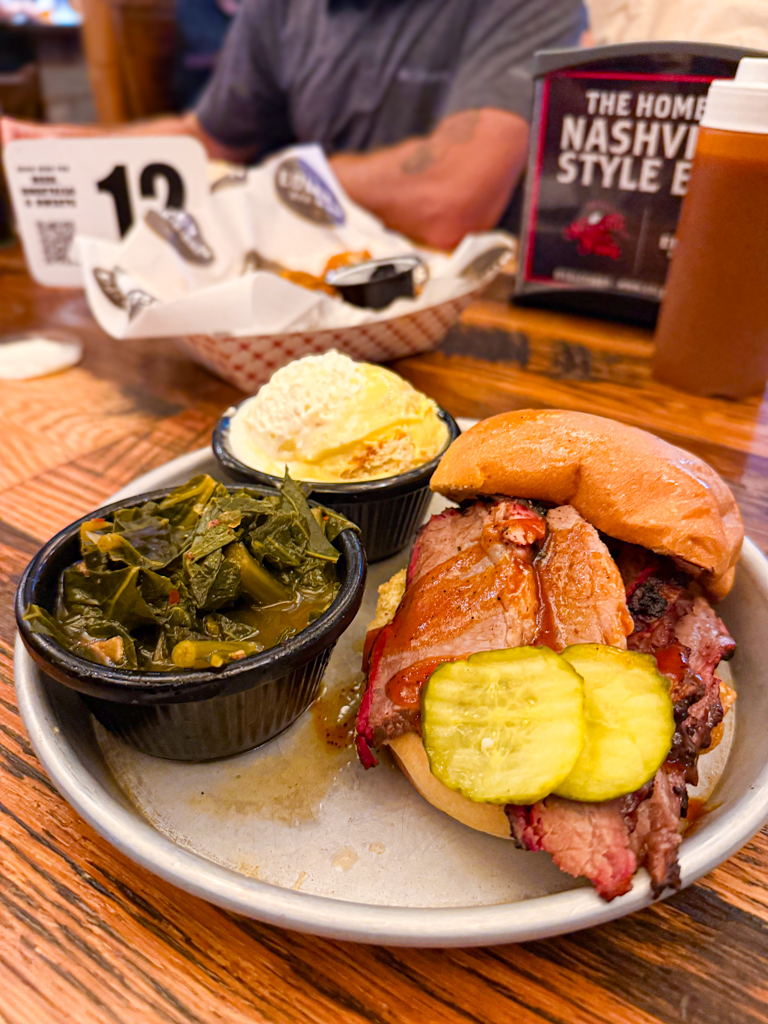 Edley’s Bar-B-Que serves up Nashville’s signature smoky flavors at multiple locations, offering brisket, ribs, pulled pork, and classic Southern sides
