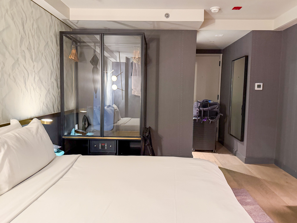 Thankfully, that’s exactly what happened. After being dropped off by my driver, I took the elevator to the second floor and checked in with the front desk. Here, it felt like The Time New York welcomed me with open arms. I was given an upgraded room and took a much needed bottle of water from the water shelf.