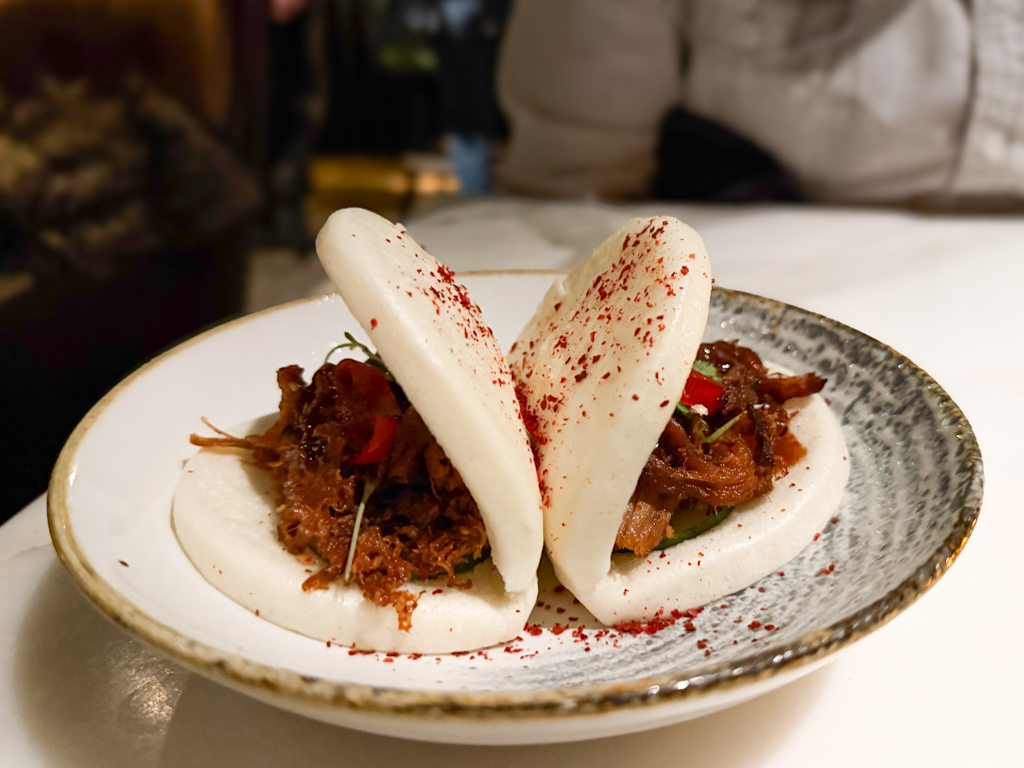 The WHISKY PORK BUNS (Japanese whisky-miso crisped pulled pork, rice flour steamed buns with lightly pickled cucumber, candied fresno chili, micro cilantro, okonomi sauce) were absolutely delicious.