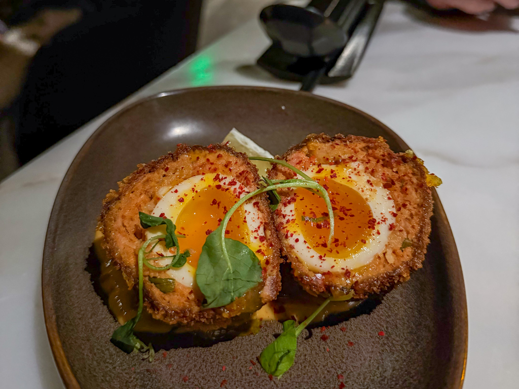 Onnik also enjoyed his SCOTCH TAMAGO (ramen egg, ginger, garlic, chili pork, panko, lemon, Japanese mustard aioli).