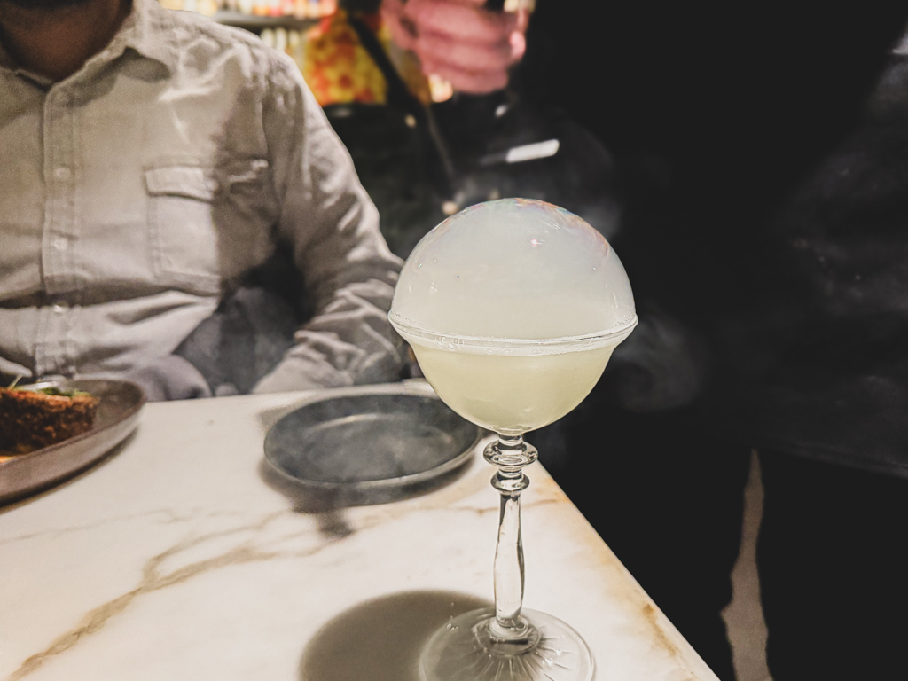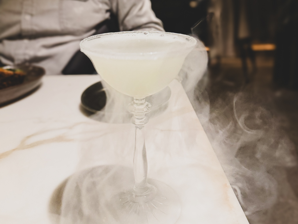To start the evening, I ordered the MEDEINA’S GROTTO (Shiso, Key Lime, Aqua Perfecta, Fontebonne, Lemongrass Aromatic). I loved the playful smoke bubble that topped and then popped on my martini glass. It was clever and well balanced.