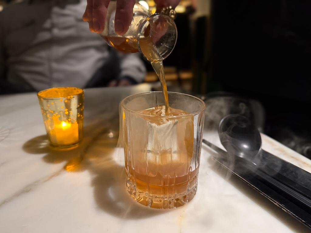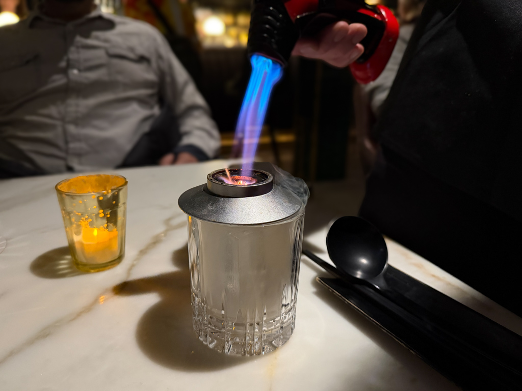 With this, I enjoyed THE FLOWERS OF EDO (Sesame Washed Overholt Bonded Rye, Honey Ginger Syrup, Orange Bitters, Smoked Ume Oolong). With this drink, I experienced the delights of table side smoked ice.