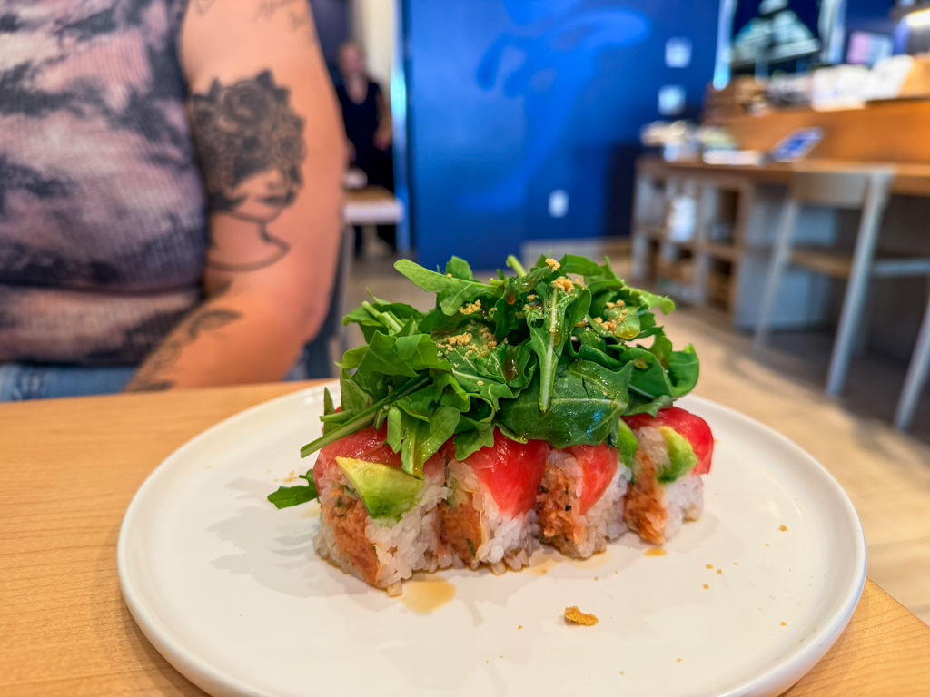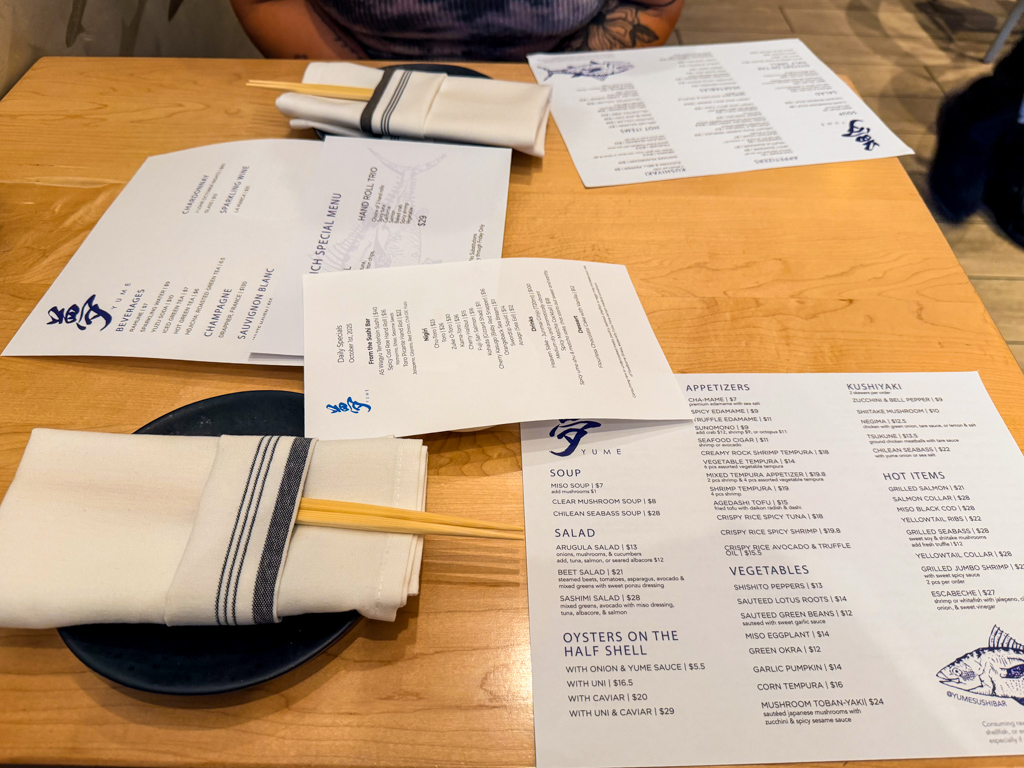 The YUME ROLL (spicy tuna roll with cucumber, topped with tuna sashimi, avocado, garlic powder, mushrooms, and arugula) was layered, fresh, and full of character.