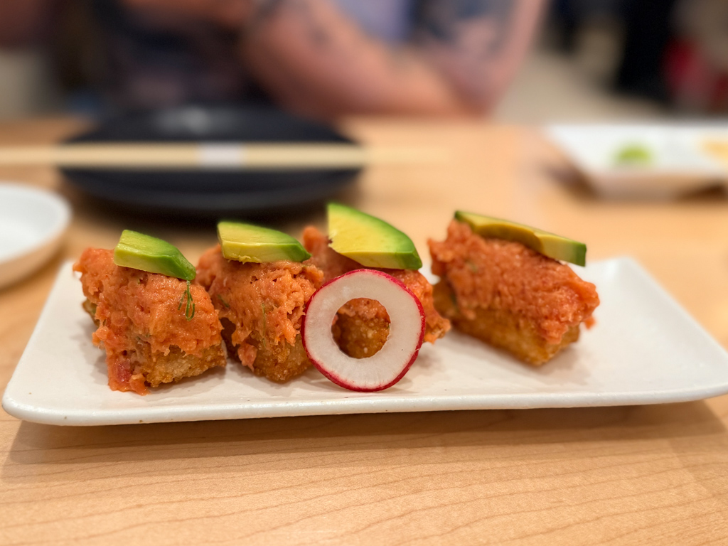 I started with a HOT GREEN TEA which, felt cozy to enjoy during the first few days of autumn. To begin, Janisse and I devoured the CRISPY RICE SPICY TUNA (crispy Rice topped with spicy tuna and a slice of avocado).